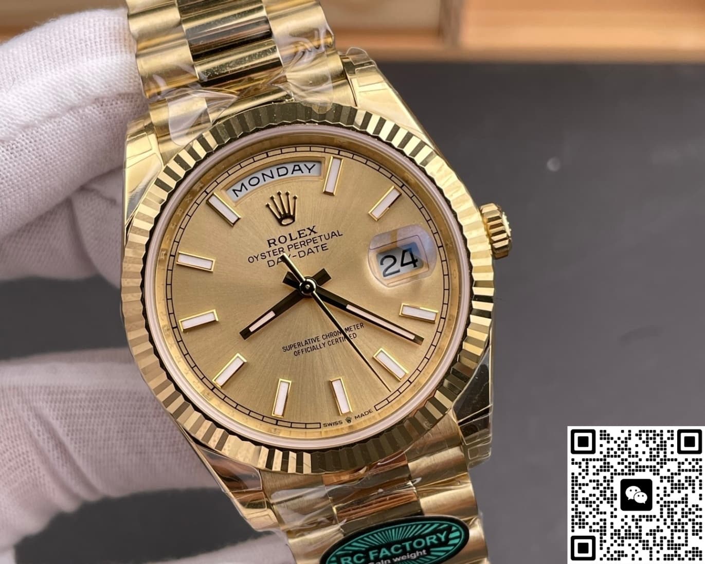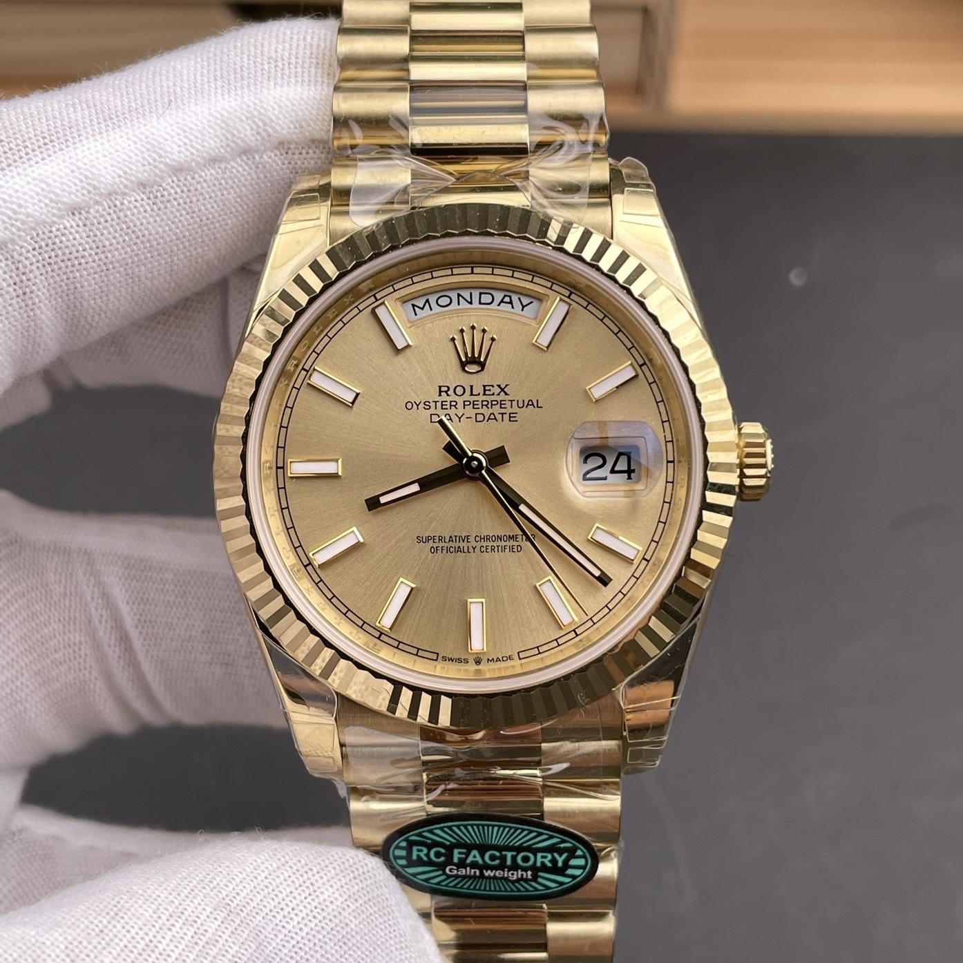 Today, I’m sharing a Rolex Super Clone watch from RC Factory. The moment I got it in my hands and compared it with the original, in terms of appearance similarity alone, it can reach over 95%. The size is also precisely replicated at 40mm, and without a close look, it’s hard to tell the difference. This watch pairs well with both professional and casual outfits. Now, let’s conduct a multi-angle review to see if the RC Factory’s Rolex Day-Date is worth getting.